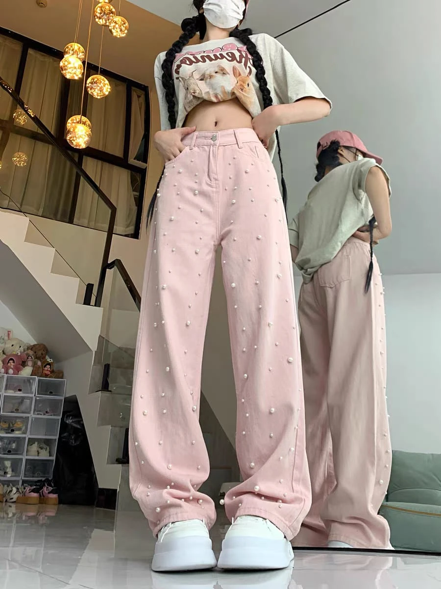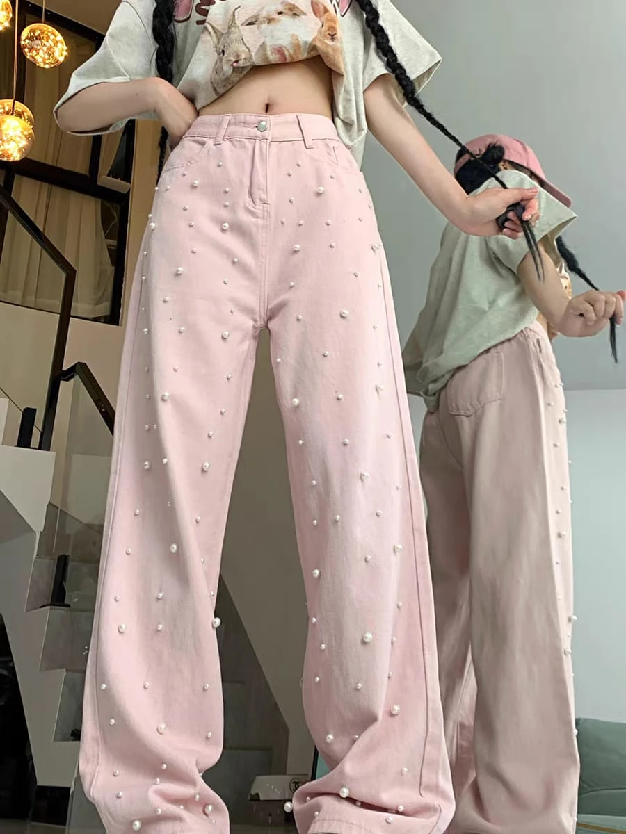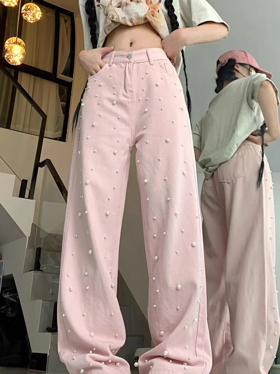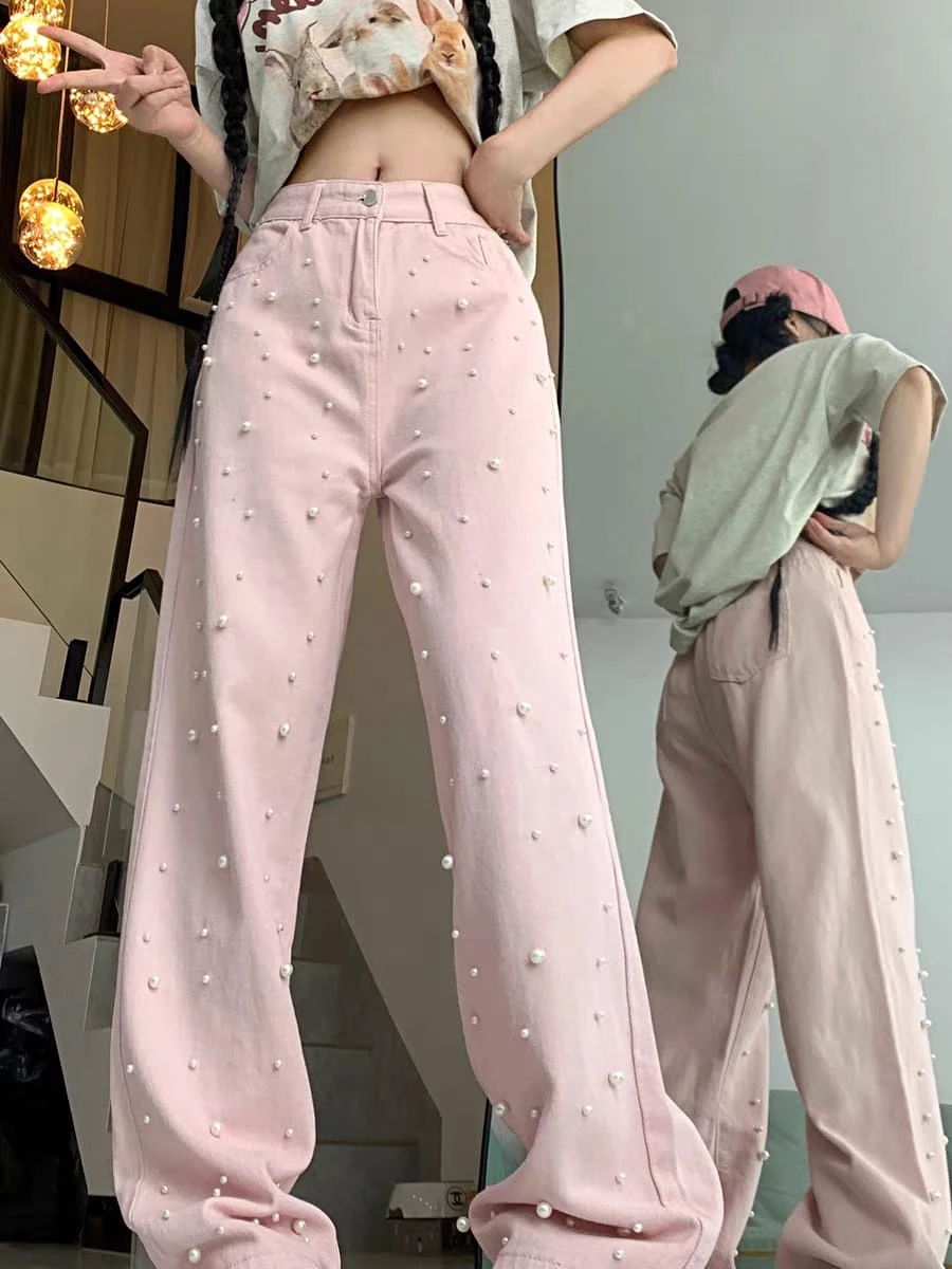 Pantalón jean rosa con perlas